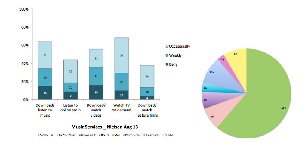 Spotify is by far the leader in the NZ market, with Nielsen recording a 61% audience share, as of August last year. Pandora, the first streaming service available on the iTunes Store, represents a 10% market share. TRN’s service iHeart Radio is slowly growing thanks to the support of it’s parent company. There are also numerous other services emerging, growing, stalling and fading away on a regular basis.